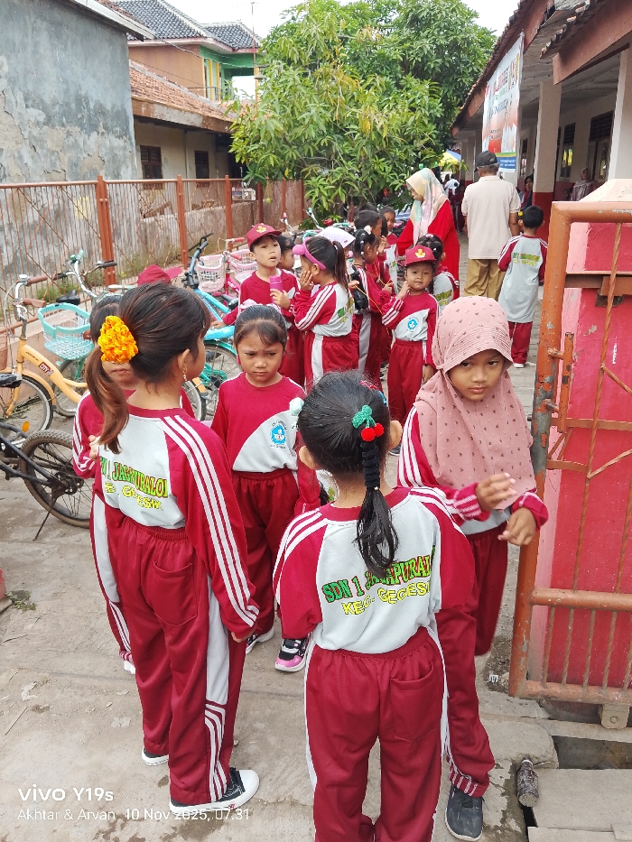 A group of children wearing matching red and white tracksuits stand outside a building with some bicycles parked nearby. The children's tracksuits have the name of their school printed on the back, "SDN 1 JAPURAT." Some of the children are wearing head coverings, and others have flowers or hair accessories. The background includes a building, trees, and a fence. The scene appears to be a school or community gathering.