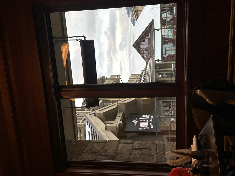 The image presents a view from inside a building, looking outward through a dark wooden window frame. The location is Teton Village, United States of America. In the immediate foreground, to the lower left, a dark polished wooden table is partially visible. It holds a small, clear glass vase containing dried, light brown pampas grass-like decorative reeds, and a dark, cylindrical condiment dispenser (likely a pepper mill). A light-colored, possibly leather, upholstered chair with a dark garment draped over its back occupies the lower-right foreground. The interior features dark wooden paneling below the window. The exterior scene reveals a snowy resort village under an overcast sky with some lighter patches. Directly outside, multiple buildings constructed with stone and wood feature snow-dusted gabled roofs and exposed balconies. A prominent black sign, suspended from an overhead structure, reads "THE HANDLE BAR WHISKEY & PATIOS" in white lettering. Several black, rectangular outdoor heaters are visibly suspended from architectural overhangs. Further into the midground, another building with a snow-covered gabled roof and a large window with distinct red framing is discernible. Bare tree branches are visible on the far right. No identifiable individuals or specific actions are observed.