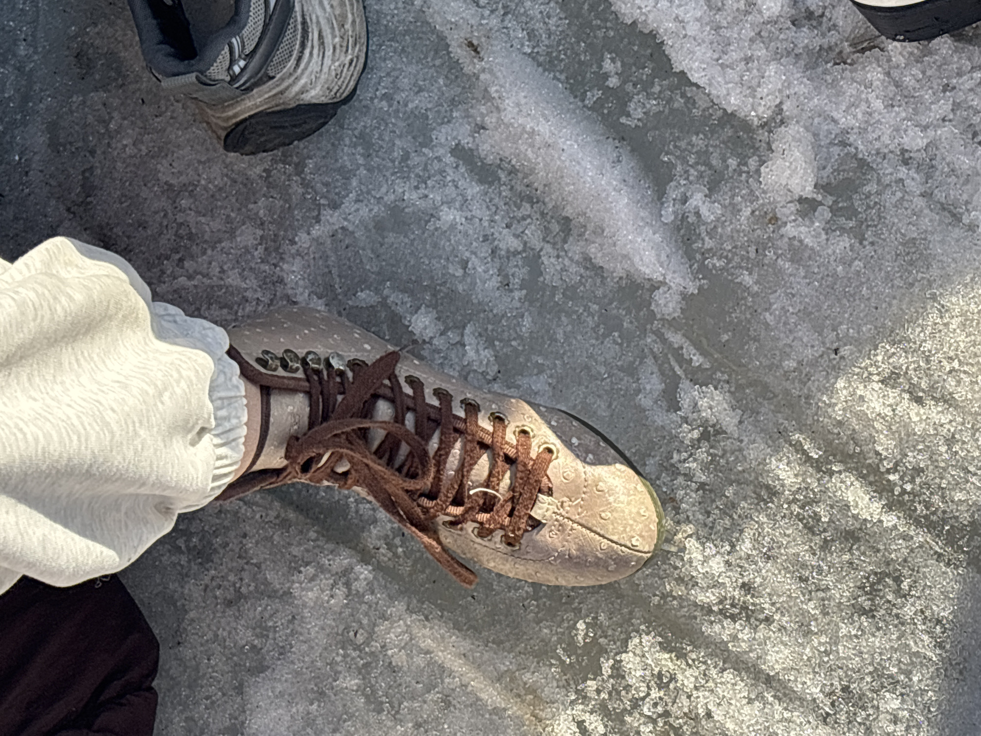 An overhead view captures the lower extremities of two individuals standing on a surface of granular ice and melting snow in Listvyanka, Russia. The primary subject wears a beige ice skate with dark brown laces, featuring a subtly textured or embossed boot, paired with light-colored, possibly white or light grey, patterned athletic pants that are cuffed at the ankle. A dark brown garment is partially visible in the upper left quadrant. To the right, the front and side of a grey and white athletic shoe with a thick, ridged sole are partially visible, suggesting the presence of a second individual. Sunlight illuminates the scene, casting shadows and highlighting the crystalline texture of the frozen ground.