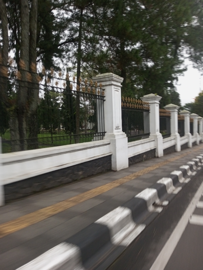 The image captures a roadside scene, depicting a long, decorative fence running parallel to a gray paved sidewalk