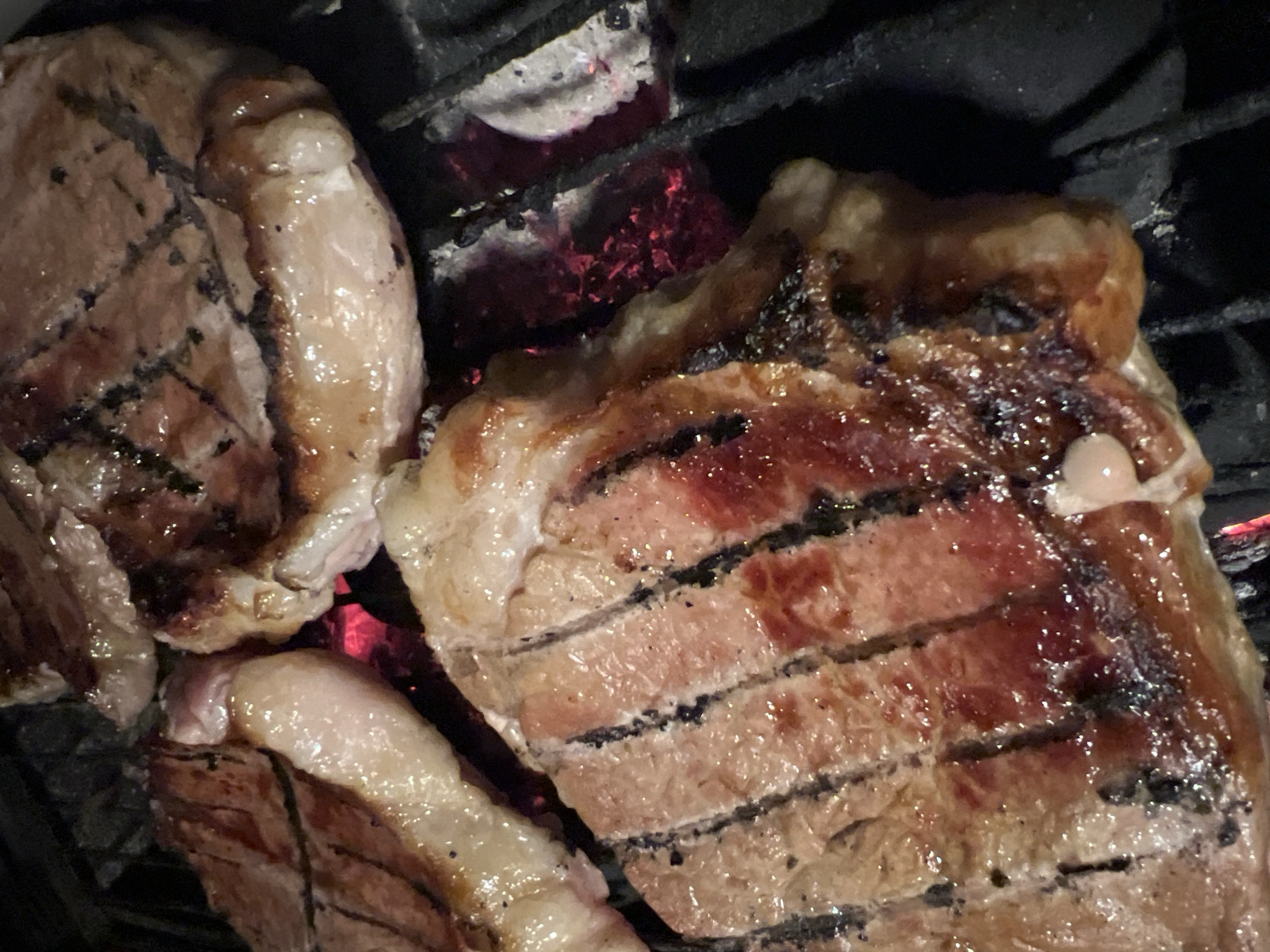 The image depicts two pieces of meat, likely steaks, grilling on a barbecue grill