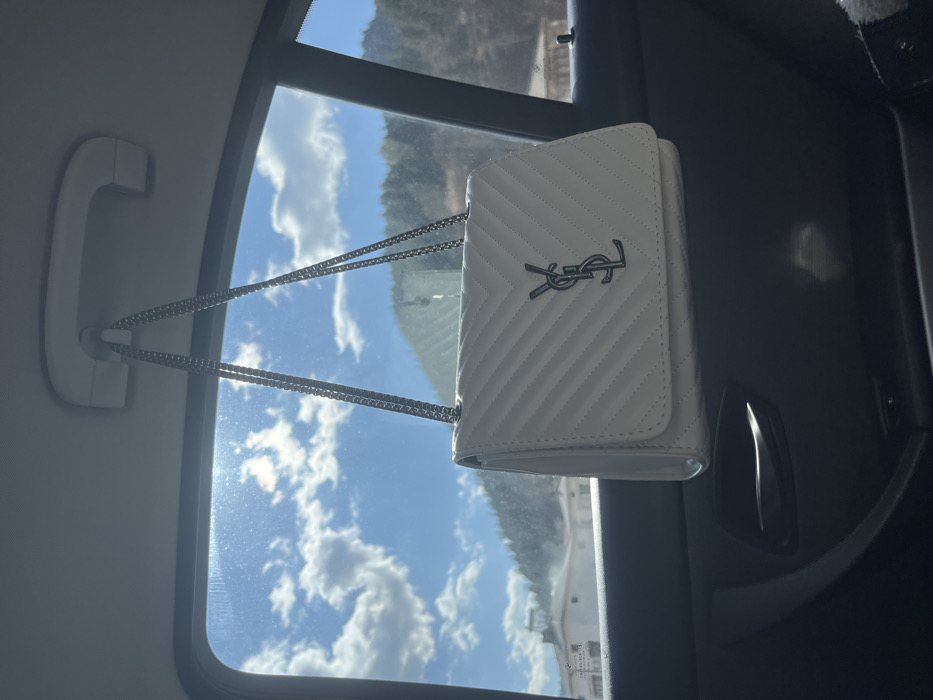 A white, chevron-quilted handbag featuring a dark, metallic Yves Saint Laurent (YSL) monogram is suspended by its silver-colored chain strap from a light-colored overhead grab handle within a vehicle interior