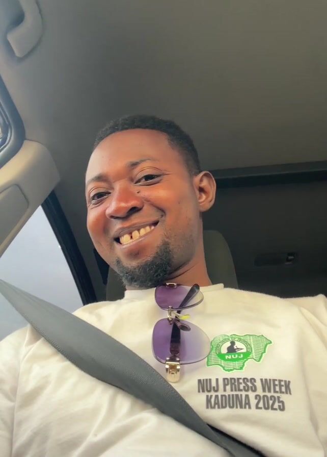 A man with a goatee is sitting in the driver's seat of a car, smiling at the camera. He is wearing a white t-shirt with the words "NUJ PRESS WEEK KADUNA 2025" and a green graphic of Nigeria. Sunglasses are hanging from the shirt. He is wearing a seatbelt. The interior of the car is visible, including the window and roof. He raises his hand to his chest. Music is playing.