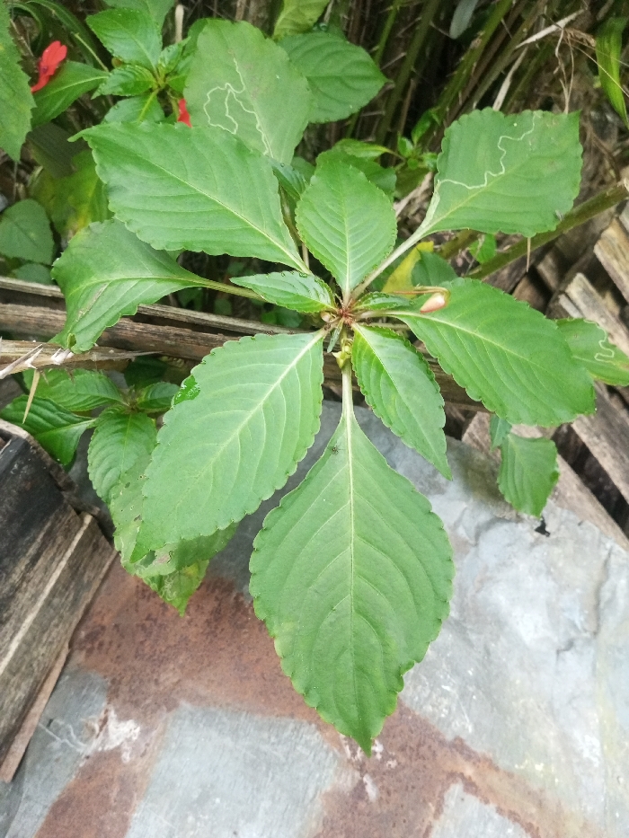 This image captures a vibrant green plant, likely *Impatiens*, located in Ciherang, Indonesia. The plant features multiple ovate to lanceolate leaves with serrated edges. Several leaves display distinct white, meandering patterns indicative of leaf miner activity. A small, red flower is partially visible amongst the foliage in the upper left quadrant, and a single, light orange-pink flower bud is present near the central stem. Several small, dark insects, consistent with ants, are observed on the leaves; one is clearly visible on the lower central leaf. The plant is situated above a weathered, dark wooden structure composed of horizontal planks or slats. Below and to the right of the plant, an irregular grey stone surface, marked with reddish-brown staining, is visible. In the upper background, dense, thin, dry plant stalks are present, forming a natural backdrop. No people or overt actions are depicted.