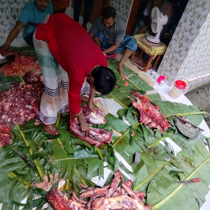 A man wearing a red shirt and white and blue patterned lungi is cutting up raw meat on a bed of banana leaves. The man is using a large knife to separate the meat. There are other pieces of meat surrounding him, as well as a metal plate, a rock, and a red container with a white lid. The man is standing in front of a building with tiled walls and a doorway. There is a small wooden table with an orange top and a white table runner beside the man. To the right of the table, there is a man sitting down. He is wearing a grey and red striped shirt, blue shorts, and white socks. He is looking off to the left side of the image. There is an electric fan with a white plastic housing behind him on a tiled platform. The scene takes place in the city of Lalmohan, Bangladesh, at latitude 22.36, longitude 90.765.
