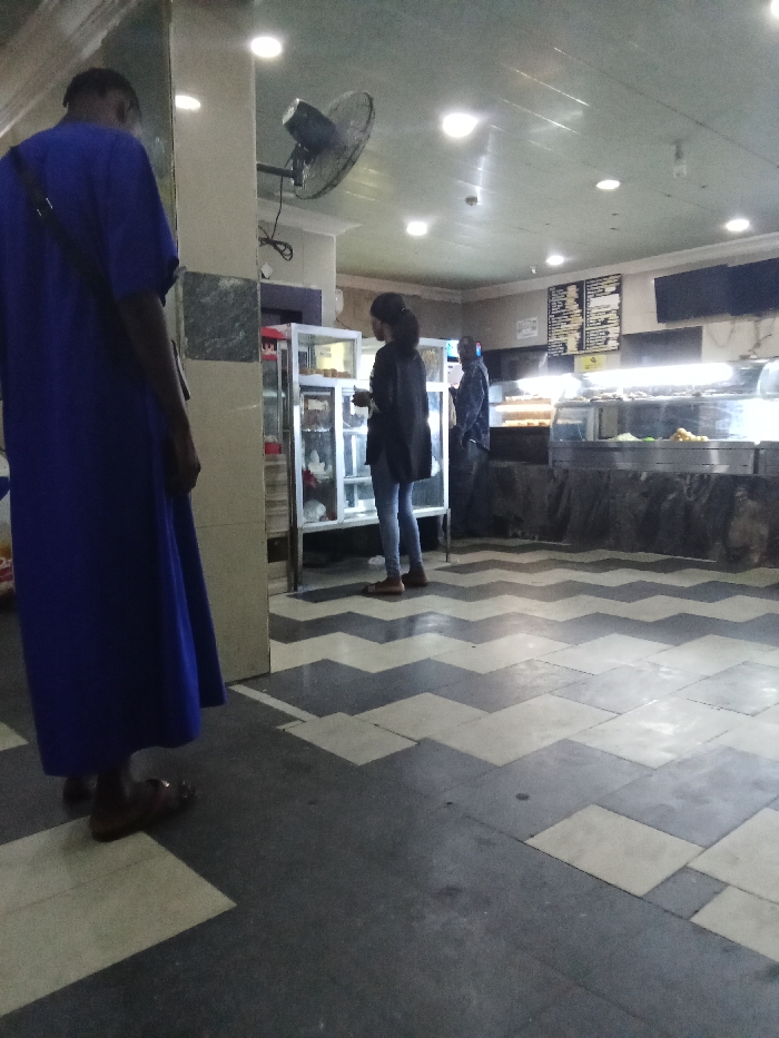 n interior scene with a person wearing a blue robe standing in the foreground. The person is looking at the camera, and their right foot is partially visible. The person is standing on a tiled floor with a black and white zig-zag pattern. The background of the image shows a woman standing in front of a glass-fronted display case. The woman is wearing a black jacket, blue jeans and appears to be looking at something in the display case. To the right of the display case is a counter with a display case containing some food. There is also a man in the image, wearing a light blue jacket, who is standing near the counter and looking at the woman in the black jacket. The man's right hand is visible and is holding a small brown bag. There are also a number of ceiling lights, a ceiling fan, and a green tiled wall in the image. The scene is located in a restaurant in Ovwian, Nigeria. The coordinates are 5.503 latitude and 5.799 longitude.