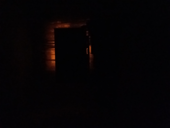 A dark scene reveals a rectangular opening, possibly a doorway or window. Ambient light, likely from an exterior source, illuminates the wall behind and slightly around the frame, creating a muted orange glow. Details within the opening are obscured by shadow, and the surrounding area remains largely undefined due to the pervasive darkness. The composition centers on the contrast between the faint light and the heavy shadows.