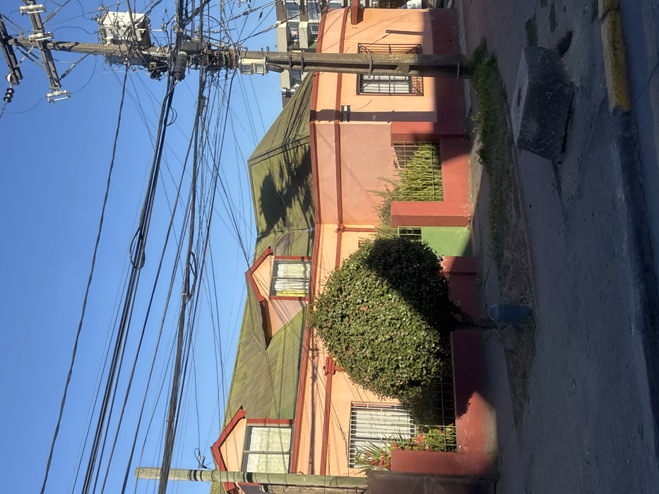 The scene depicts a street view in Penco, Chile, featuring a two-story residential building under a clear blue sky