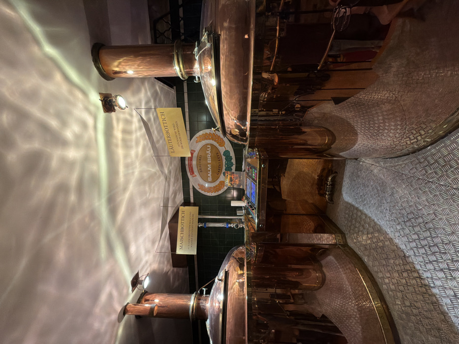 The image showcases brewery equipment, likely copper brewing kettles, with informative plaques. One sign reads "MAISCHBOTTICH," explaining it's where ground malt and water create mash. Above it, another sign, "LÄUTERBOTTICH," describes the process of extracting wort from the mash. Between the two, there's a round sign with "Brauerei SALM BRÄU Gaststätte," indicating the brewery's name. The lighting is dramatic, casting textured shadows on the wall. The floor is metallic and non-slip.