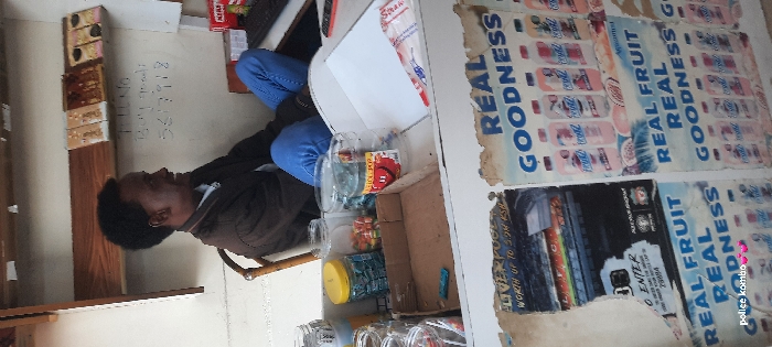 A man sits inside a small shop, visible from the torso up. He wears a brown jacket and blue jeans. Behind him, the wall has shelves displaying rectangular desserts. To his right, behind a white countertop filled with various jars, are aging posters promoting "REAL FRUIT REAL GOODNESS," and an ad with "ENTER" and "23804" visible. The countertop surface is also littered with a white notepad. Handwritten numbers are visible on the wall behind the man.