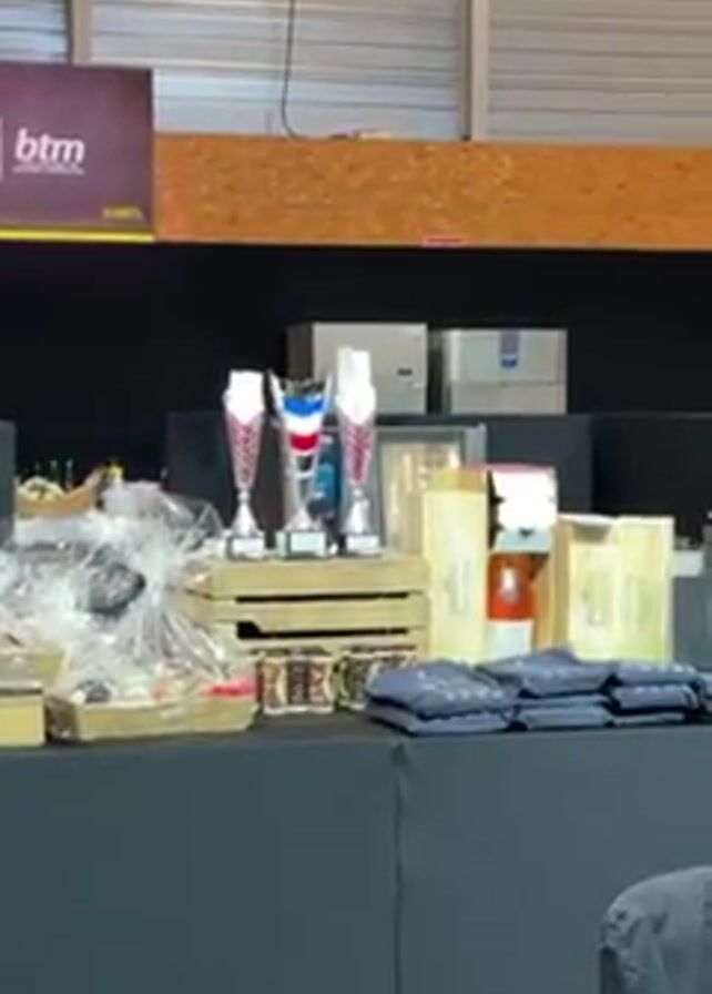 The video opens with a view of a table laden with prizes, including three trophies, gift baskets, bottles of wine, and neatly folded shirts