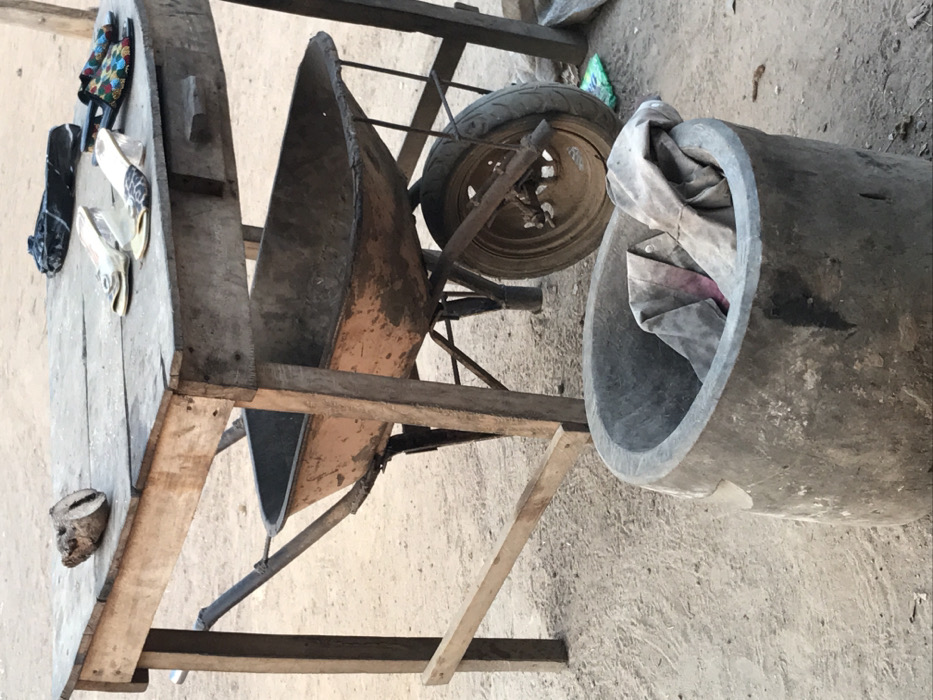 An outdoor scene presents a collection of objects. A wooden table holds sandals and a carved wooden head. Next to the table sits a rusted wheelbarrow with a tire. A gray cylindrical container partially filled with cloths rests on the ground. The scene suggests a work area, with worn tools and materials. The ground appears to be compacted earth.