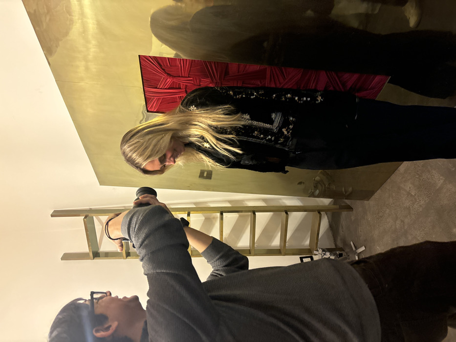 A person wearing glasses and a gray sweater holds a camera, photographing a woman with blonde hair wearing a black jacket. Behind the woman is a gold wall with a rectangular red art piece. A metallic ladder is visible, positioned vertically between the photographer and the woman, leaning against a white wall. The scene is brightly lit, and the image appears to be taken in an art gallery or studio.