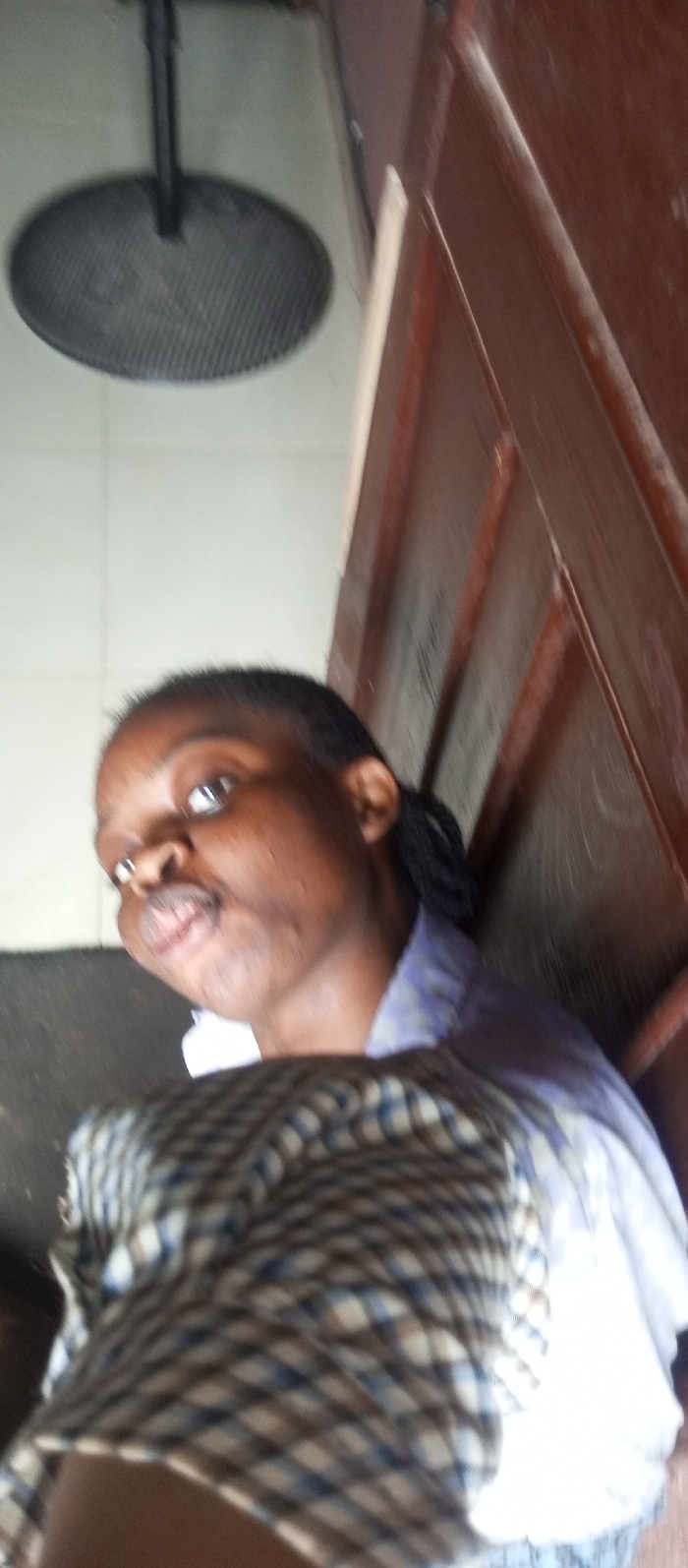 The image captures an indoor scene in Abuja, Nigeria, featuring a person of African descent. The individual, appearing to be a young adult or teenager, is positioned at an angle, looking upwards and slightly to the viewer's left with their cheeks visibly puffed out. They have a dark complexion and dark hair pulled back, possibly in braids or dreadlocks. The person is wearing a light-colored collared shirt, partially covered by a garment with a brown, white, and light blue plaid pattern. In the background to the left, a light-colored tiled floor is visible, upon which rests a dark, circular, mesh-covered base of a standing fan. To the right, a reddish-brown wooden door or wall paneling, characterized by vertical grooves, frames the scene. The image exhibits a noticeable tilt.