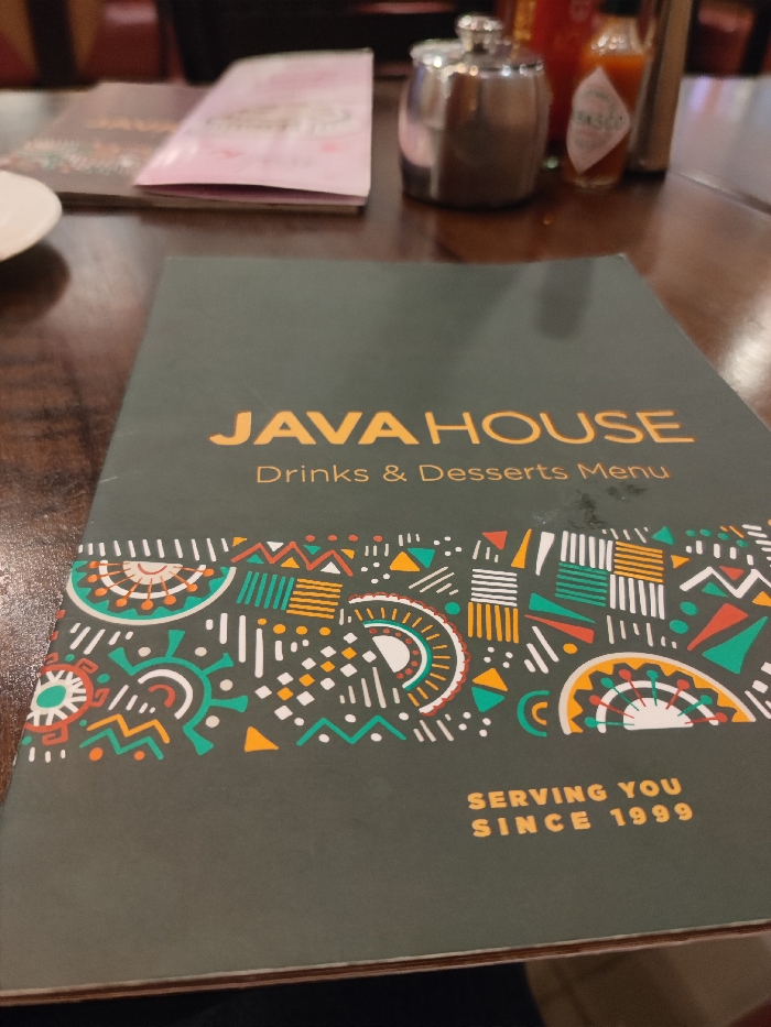 The image depicts the interior of a Java House restaurant, likely in Nairobi, Kenya
