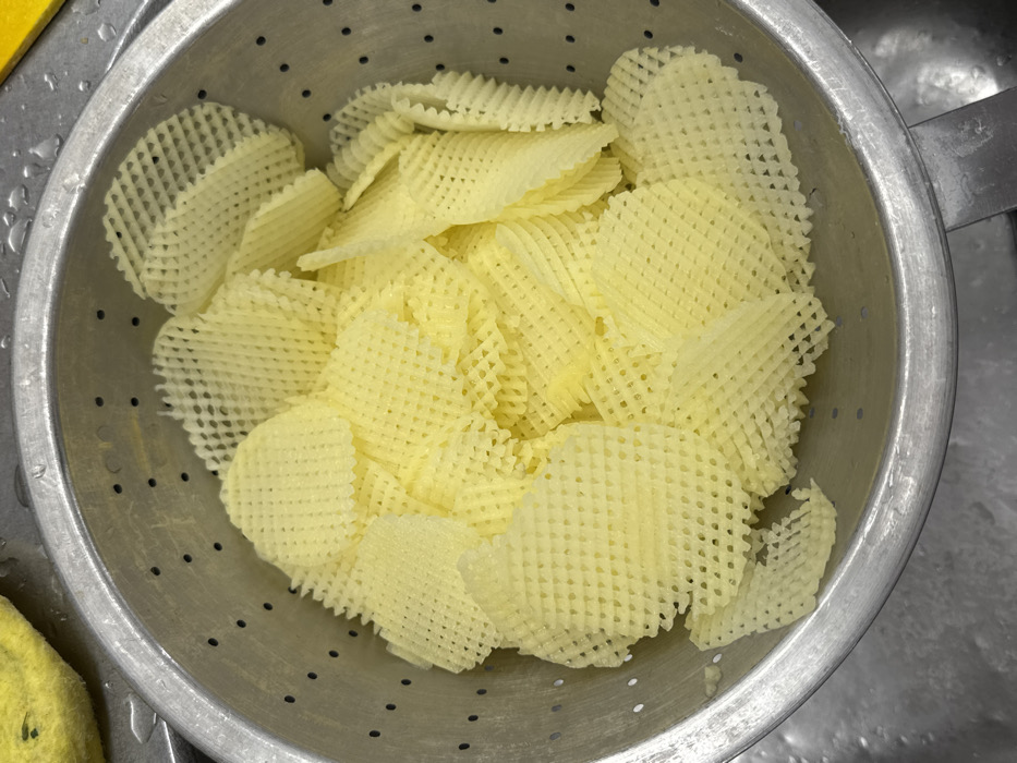 - "An overhead view captures a circular, silver-toned metal colander filled with numerous raw, thinly sliced potatoes cut in a waffle (gaufrette) pattern" by FM-MKghF3, licensed under CC BY 4.0