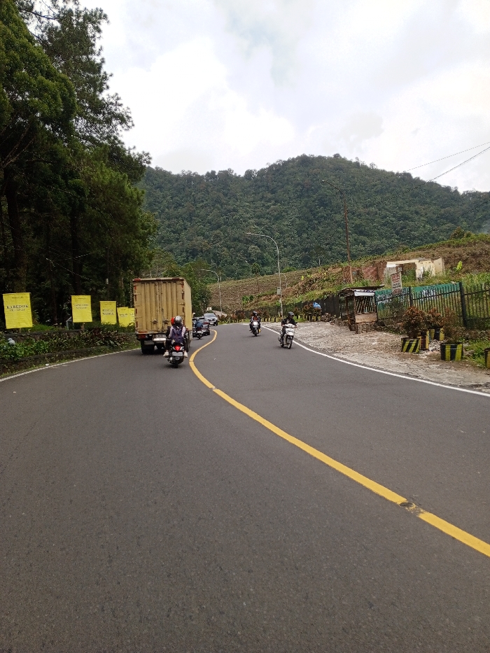 The scene depicts a segment of an asphalt road in Cisarua, Indonesia, under an overcast sky. The road features a solid yellow centerline and curves gently to the left, indicating a no-passing zone. On the left side of the road, a tan box truck is positioned, followed by a line of passenger cars. A motorcycle with two helmeted occupants is situated to the right of the truck. Further along the road, two additional motorcycles with single helmeted riders are visible, traveling in the same general direction. On the far right, another motorcycle with a single helmeted rider is present, possibly turning or traveling in an opposing direction. The left edge of the road is bordered by a stand of tall pine trees and multiple yellow rectangular banners. The right side features an unpaved shoulder with a small, rustic open-sided structure, a dark green metal fence, and a rising, terraced hillside with sparse vegetation. A large, densely forested mountain dominates the background.