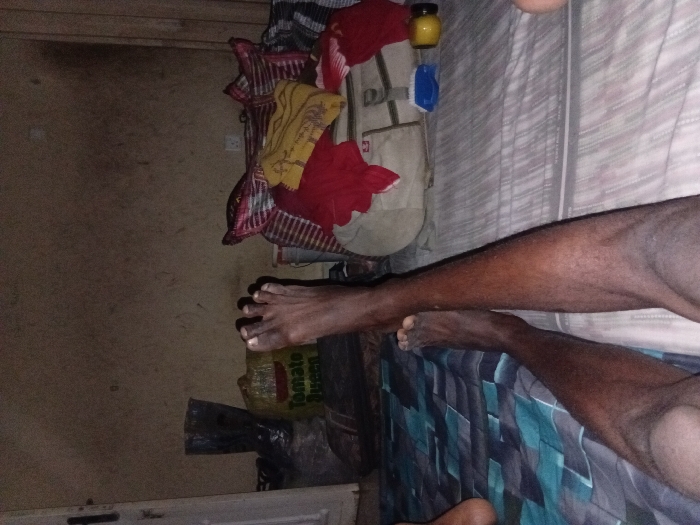 A person lies on a bed with their bare legs extending towards the center. Cluttered around the bed are various items including bags, bottles, and fabric. The room has a simple, aged appearance. The lighting is dim, giving the scene a slightly muted atmosphere.