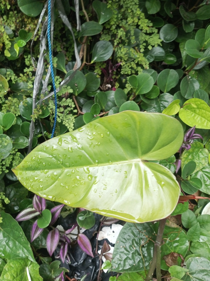 The image displays a close-up, top-down perspective of a lush vertical garden in Khammam, India. Dominating the foreground is a large, heart-shaped, vibrant green leaf, possibly a Philodendron species, heavily covered in numerous distinct water droplets. The leaf exhibits visible vein patterns. Behind this central leaf, a dense array of assorted green foliage creates the background. Various plant types are identifiable: small, rounded green leaves resembling Peperomia species, delicate fronds indicative of ferns, and distinctive purple-striped leaves consistent with Tradescantia zebrina (wandering jew) in the lower left quadrant. Additionally, darker green, textured leaves are visible towards the lower right. A thin, braided blue rope hangs vertically in the upper left background, intertwined with dried plant matter. Black plastic sheeting or fabric is discernible beneath some of the plants in the lower central area, suggesting a structured planting arrangement. No individuals or specific actions are depicted.