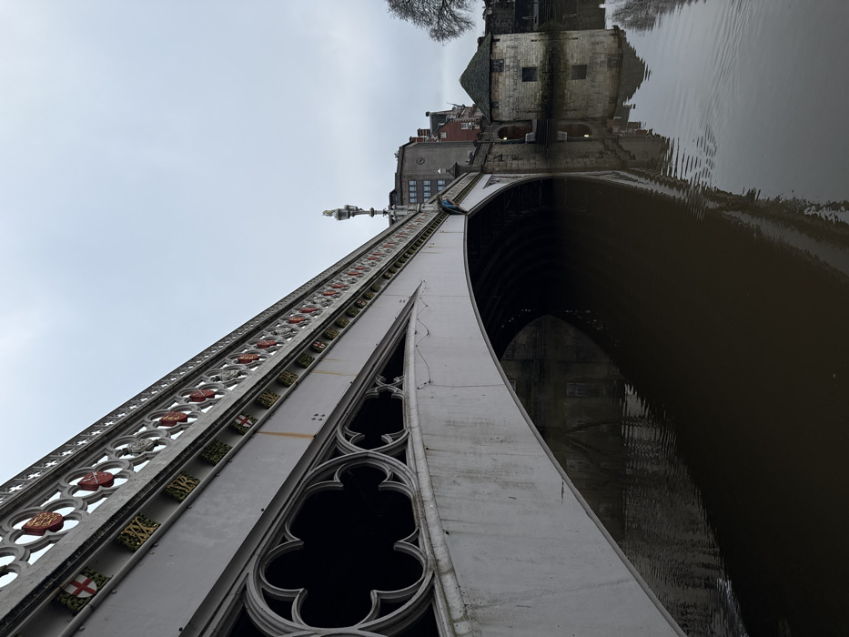 A low-angle shot of a bridge, emphasizing its architectural details. Ornate metalwork lines the bridge's side, featuring quatrefoil designs. A tower-like structure is at the top of the bridge. Its reflection is visible in the dark water beneath the arch. The sky is overcast, creating a gray backdrop. The composition is tilted, adding a dynamic perspective.