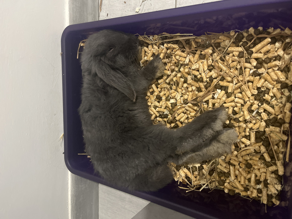 - "A gray rabbit sprawls comfortably in a rectangular purple litter box" by FM-PwRFu2, licensed under CC BY 4.0