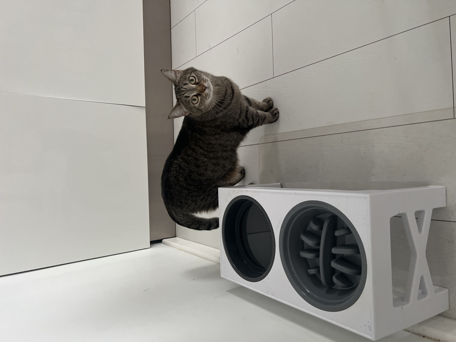 The scene depicts an interior domestic setting. Specific details identifying the city as Izhevsk, Russia, are not present within the image. A short-haired tabby cat, exhibiting brown and grey striped fur, stands on a light-colored floor, oriented towards the viewer. The cat's head is slightly tilted, and its eyes are wide open, fixed on an unseen point beyond the camera. To the immediate left of the cat is a white, elevated pet feeding station. This station features two circular grey bowls: the upper bowl is a standard design and appears empty, while the lower bowl is a slow-feeder design with internal ridges, also appearing empty. The feeding station rests on a clear plastic mat or protector strip laid over the flooring. The floor consists of light-toned panels, possibly laminate or tile, with visible seams. The background includes a white wall to the left and two large, off-white, handle-less cabinets or cupboards directly behind the cat and feeding station. A narrow, dark baseboard or toe-kick is visible where the cabinets meet the floor. No human subjects are visible.