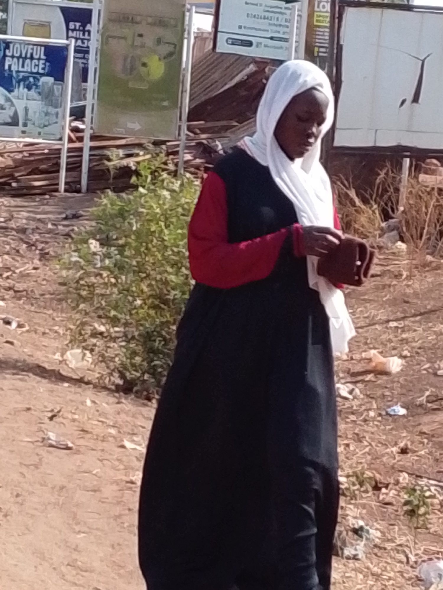The image displays an outdoor scene in Dungu, Ghana. A single adult female is positioned centrally, standing on an unpaved dirt surface. She wears a white head covering, a red long-sleeved shirt, and a black floor-length outer garment. Her gaze is directed downwards towards a small, dark brown, folded object that she holds in her hands. The ground beneath her is a mix of dry earth and scattered light-colored litter. To her immediate left, a green bush is visible. In the background, multiple commercial signs are erected on metal poles, with one sign clearly displaying "JOYFUL PALACE" and another partially visible sign including "ST. A MILL". Behind these signs, piles of wooden planks and structures constructed from corrugated metal are present. Sparse, dry vegetation is visible on the right side of the background.