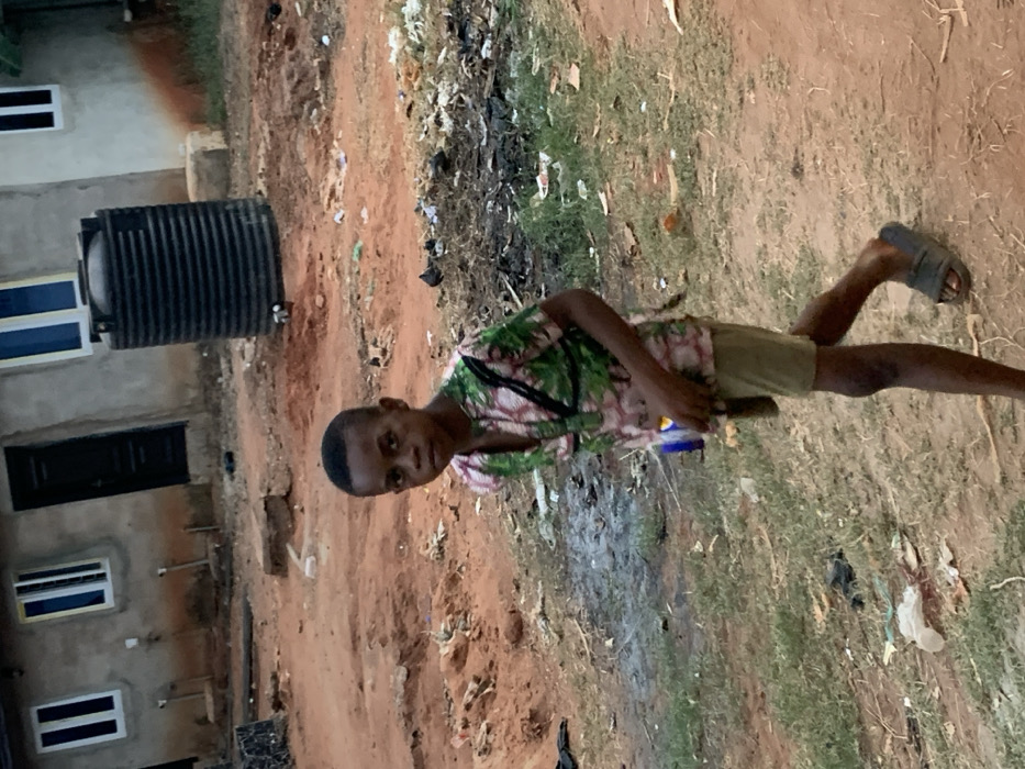 A young boy stands outdoors, wearing a floral shirt and shorts, holding an object in his hand. He has short, dark hair and looks towards the camera. Behind him, there's a two-story building with windows, a black water tank, and a black door. The ground is a mix of dirt, grass, and scattered trash. The scene appears to be a residential area in a somewhat unkempt environment.