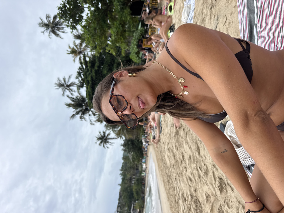 A woman in a bikini lies on a sandy beach, wearing sunglasses and a gold necklace. Palm trees and other greenery are visible in the background, along with numerous people. The sky is overcast. The woman has a tattoo on her left forearm and a small tattoo on her right arm. She is sticking her tongue out.
