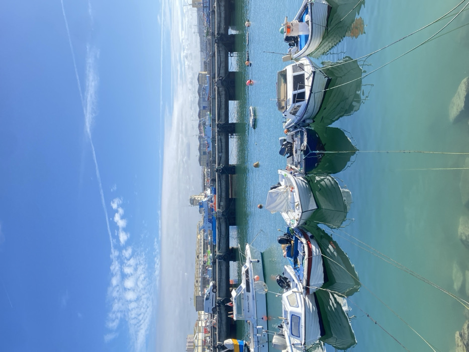 This image depicts a segment of the harbor in Peniche, Portugal, under bright, sunny conditions
