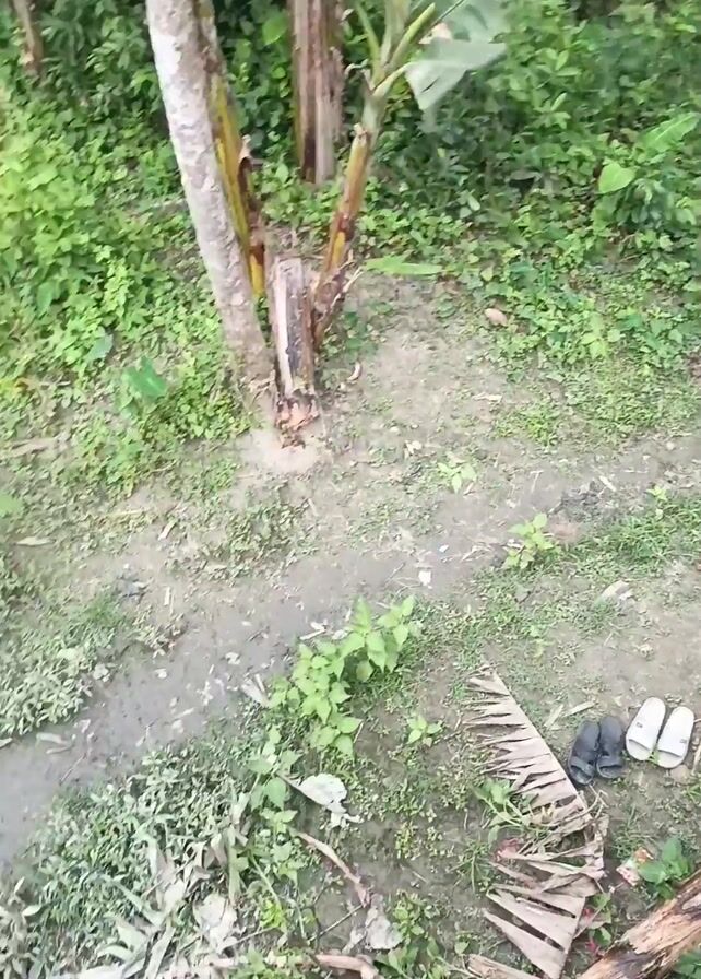 lush, green outdoor environment with banana trees and various plants. The camera then shifts to an overhead view of a waterway with two men working in the muddy bank. They are dressed in traditional clothing and appear to be digging or collecting something from the mud. There are discarded objects and vegetation scattered around them. The scene is shot from a low bridge or platform.