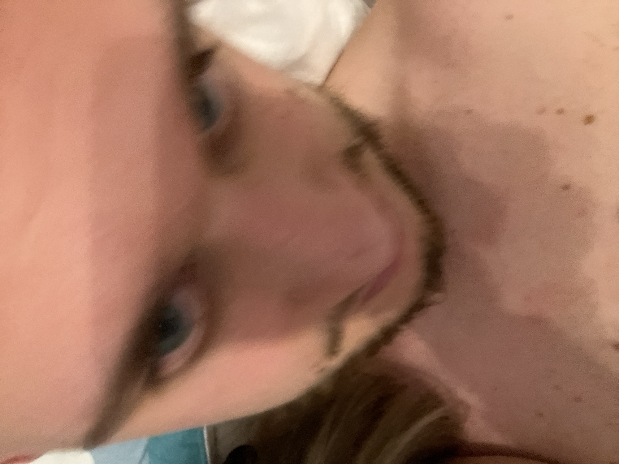 Close-up image of a fair-skinned person with blue eyes, brown hair, and a patchy beard