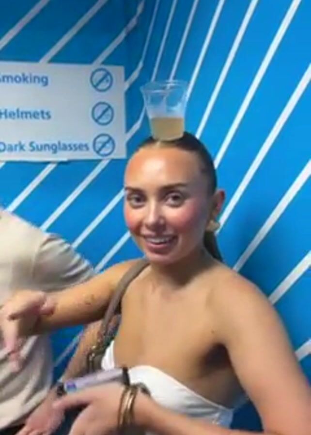 The video depicts a young woman with her hair pulled back and wearing a white strapless top, smiling directly at the camera. She has a small, clear plastic cup filled with a yellow liquid balanced on her head. She gestures with her left hand towards the cup while smiling. Behind her and slightly to the left is a man in a beige polo shirt and dark pants, partially visible. The background is a wall with a bright blue and white diagonal stripe pattern. There is also a white sign with black text and prohibition symbols indicating that smoking, helmets, and dark sunglasses are not allowed. The video appears to be taken in a confined space.