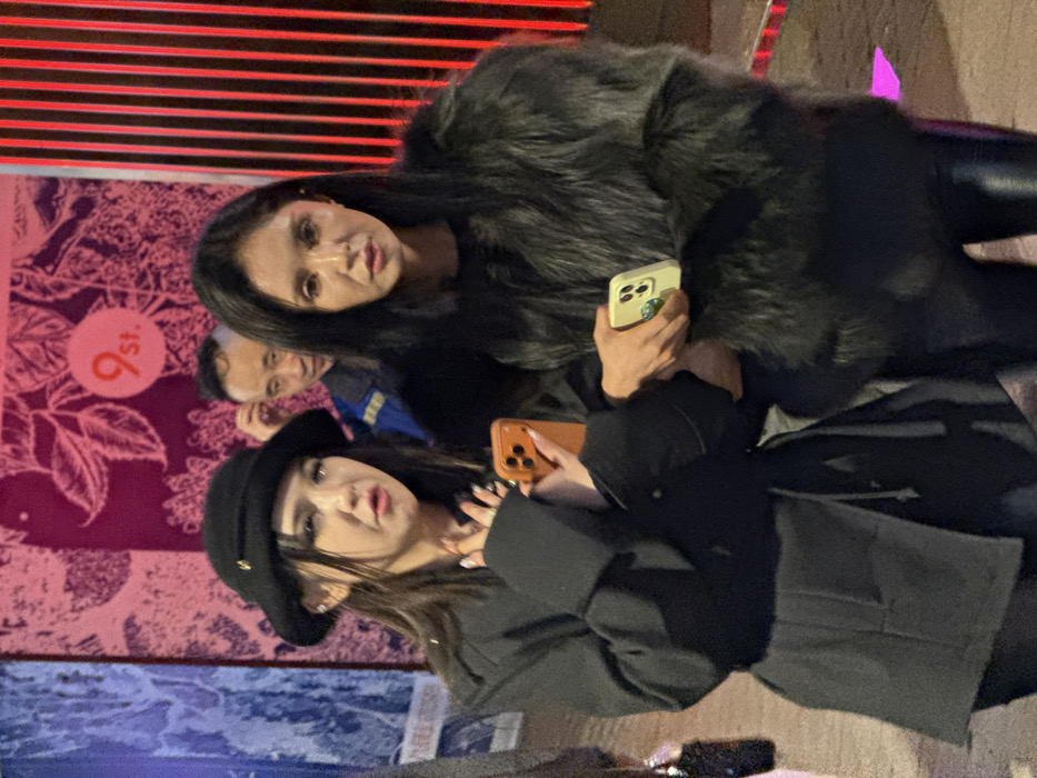 The image depicts an urban street scene at night in Jiangbei, China, featuring three individuals. In the foreground, two East Asian women are positioned closely. The woman on the left wears a black bucket hat and a dark, tie-waist coat. She holds an orange-cased smartphone in her right hand at chest level. Her left hand is raised near her neck, and her mouth is open. She has light-colored fingernail polish. The woman on the right, with long dark hair, is dressed in a black faux-fur coat and dark, tight-fitting pants appearing to be leather. She holds a pale yellow-cased smartphone with a green circular grip in her left hand at waist level. Her left arm is interlocked with the left woman's right arm. Her facial expression is neutral. She also has light-colored fingernail polish. Partially visible in the background, between the two women, is an East Asian man with a balding head, wearing a blue collar or uniform, looking towards the foreground. The immediate background features a large, illuminated pink panel displaying white botanical patterns and the text '9st.' in white with a red 'st.'. To the right of this panel are vertical red light strips. To the far left, a dark blue textured surface is visible. The ground is dark, consistent with a paved urban surface.
