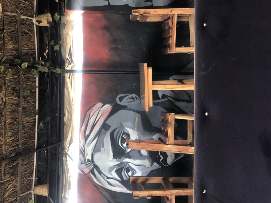 An outdoor space features a mural of a person's face painted on a dark wall. Wooden tables and a dark purple couch are situated in front of the mural. A woven thatched roof covers the left side of the scene, with vines draping along the edge. Bright light filters through an opening, creating a stark contrast.