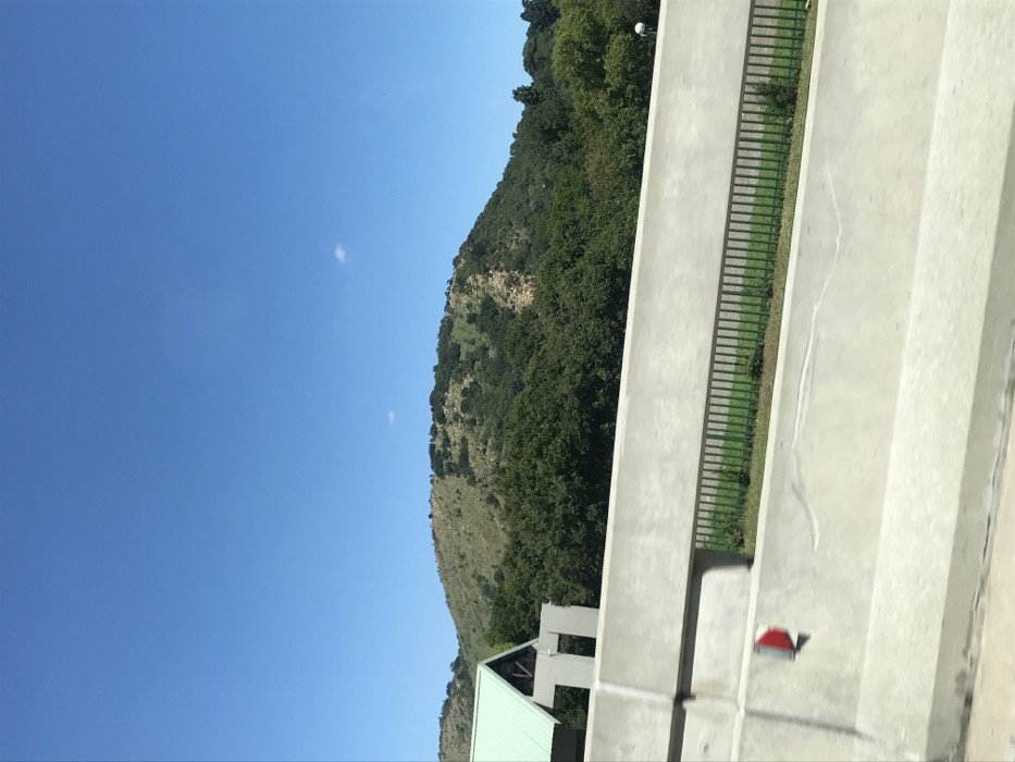 A landscape featuring a hillside with green vegetation under a clear blue sky. To the right, there is a concrete structure, possibly a bridge or building, with a green metal fence along its edge. A section of a green roof is also visible. The orientation of the image is tilted, which can cause the horizon appears diagonal.