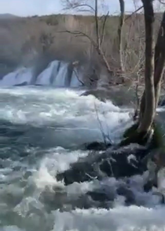 wide, fast-flowing river leading to a waterfall in the distance. The river is turbulent with white water and some visible rocks. The waterfall appears to be multi-tiered. The banks of the river are lined with trees, most of which are bare, and there is a distant hillside covered in trees. The sky is partly cloudy.