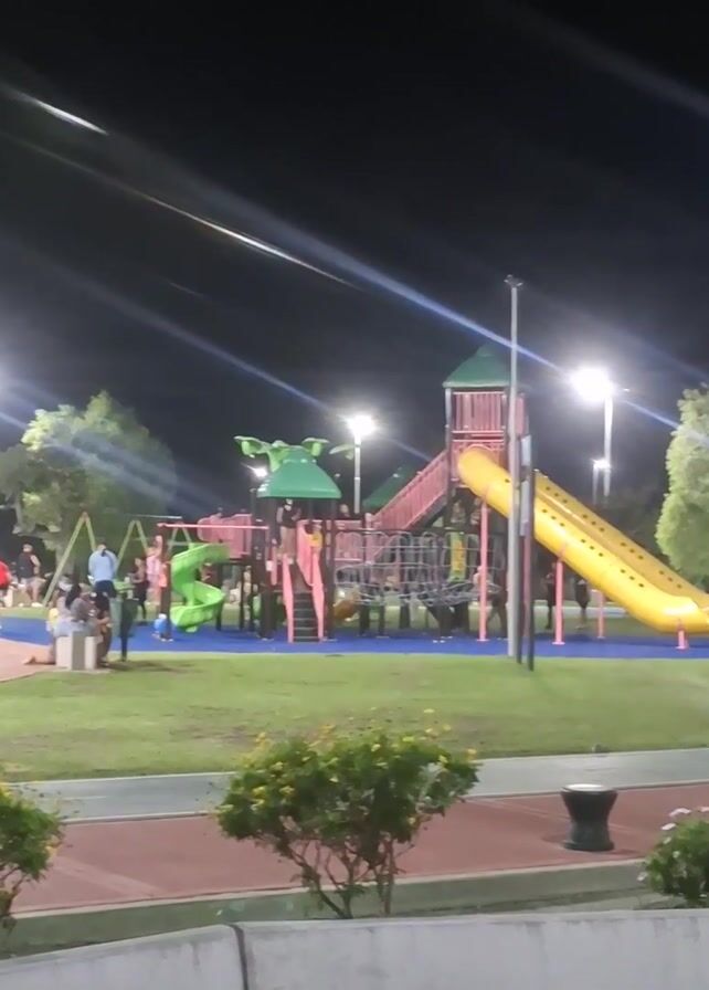 At night, a brightly lit public park with play structures is visible