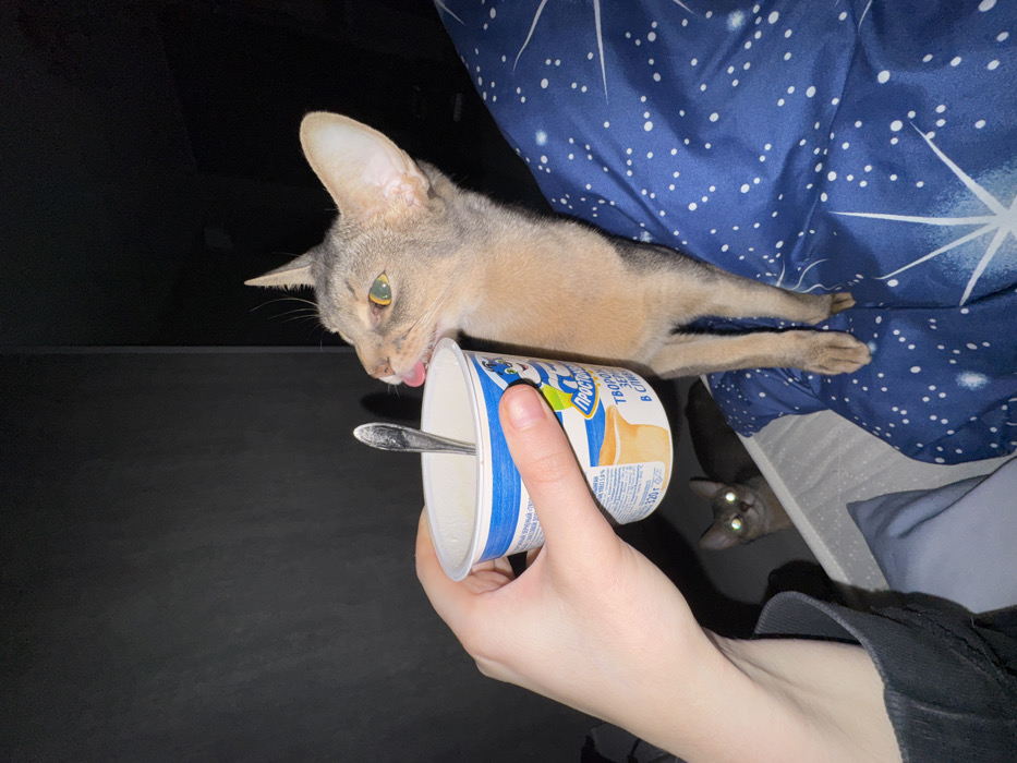 A person holds a container with a spoon, offering it to a cat that is licking its contents. The cat is light brown and grey with large ears. Another cat can be seen in the background with glowing eyes. The background includes a dark surface and a blue fabric with white star-like patterns. The hand holding the container is pale and has a long sleeve.