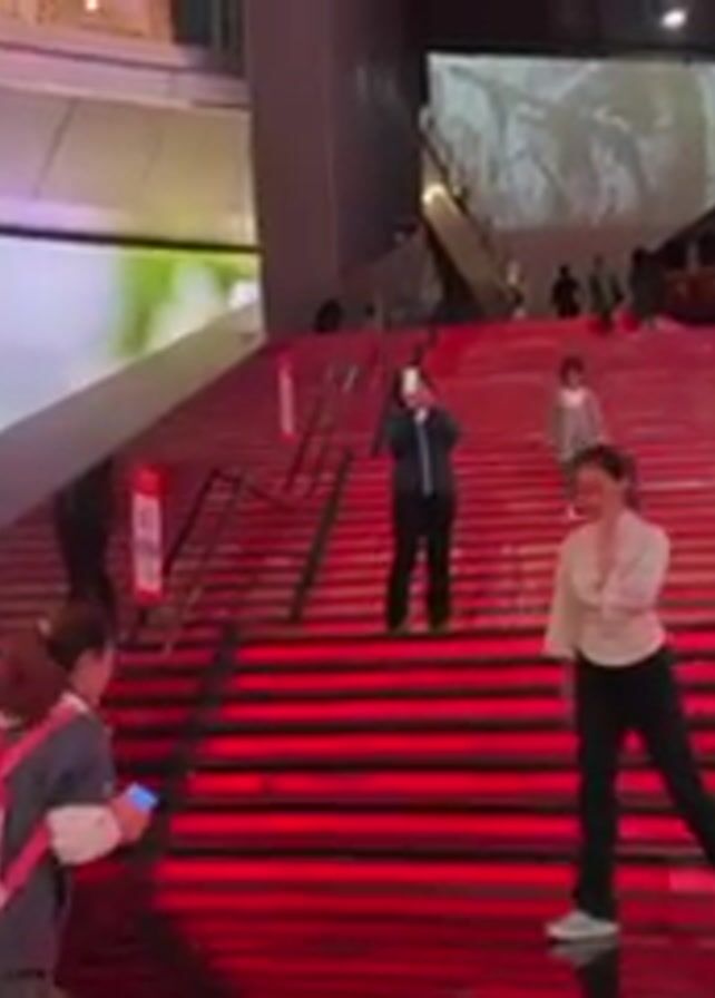 large indoor space, possibly a mall or public building, with a grand staircase prominently featuring red LED lighting. Several people are on or around the staircase. A woman in black pants and a light-colored top is dancing on the stairs. Another woman, wearing a backpack, is walking up the stairs while looking at her phone. Others, including a child, are either standing or walking on the staircase, some appearing to be taking pictures. Above the staircase is a large curved video screen displaying lush greenery. The scene seems lively with movement and visual elements.