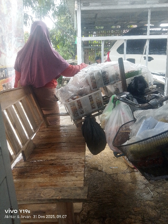 An outdoor scene in Jagapura Kidul, Indonesia, shows a person facing away from the camera, wearing a pink hijab over an orange long-sleeved shirt and light-colored pants. This individual is leaning against a weathered wooden bench on the left and appears to be attending to a heavily loaded pushcart positioned in the center. The pushcart contains multiple white plastic crates filled with various items, largely covered in clear plastic sheeting. Several additional transparent plastic bags and a black plastic bag are hanging from the cart's frame, which also features a black wire mesh basket overflowing with contents on the right side. The handlebars of the cart are visible. In the background, a white vehicle (possibly an SUV or minivan) is parked or partially visible behind a metal-framed structure. A second individual, appearing to be a male child or young person in a dark shirt, is partially visible in the distant background. The ground is an uneven, damp surface, and green foliage is visible beyond the structure. The lighting suggests daytime conditions.