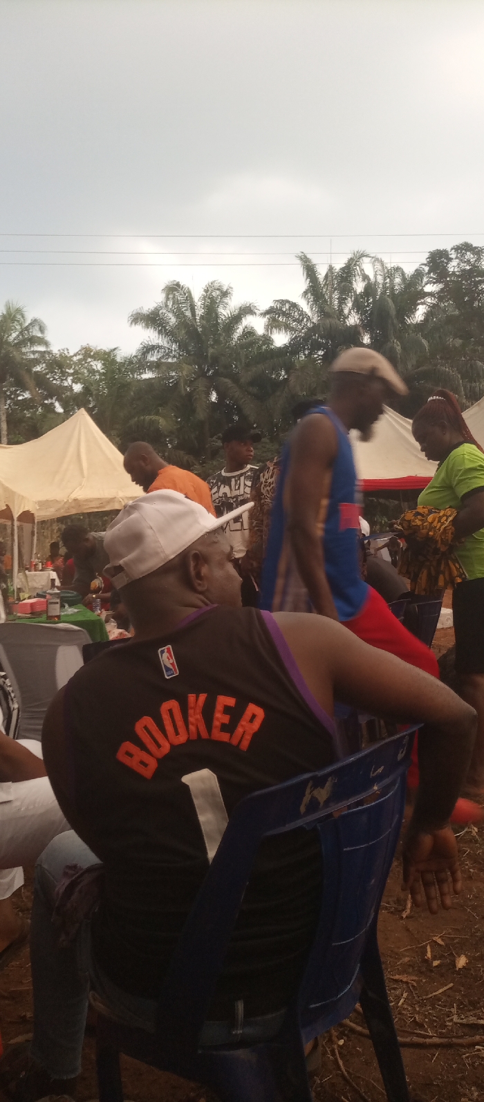 A man wearing a Booker basketball jersey and a white cap sits in a blue plastic chair. Several other people are nearby, some standing and others seated. There are white tents and palm trees in the background. The sky is overcast. The ground appears to be dirt.