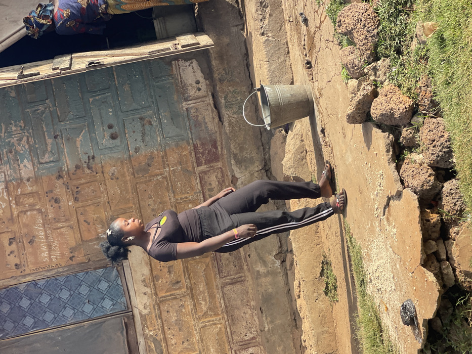 A woman in black clothing lies on a concrete surface next to a building. A metal bucket stands nearby. The building has a weathered door and some writing on the wall. Adjacent to the concrete, there are dark, porous rocks, and patches of grass. The photo appears to be taken outdoors in daylight, with the woman's posture suggesting she might be resting.
