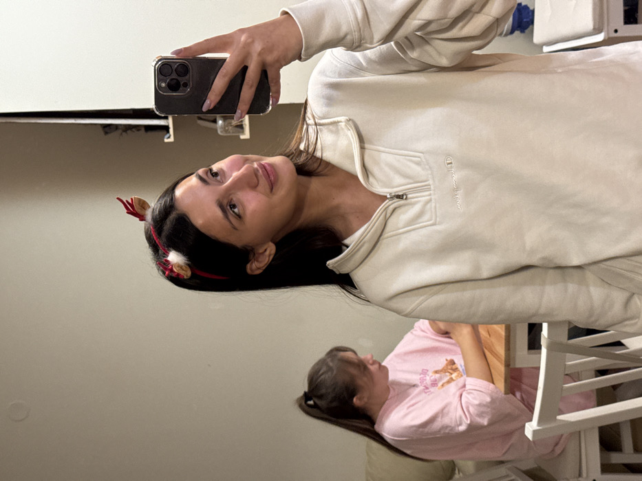 A young woman with dark hair is taking a selfie in a mirror. She is wearing a white Champion zip-up sweatshirt and a reindeer antler headband. Her phone is an iPhone with three lenses. A reflection of another girl wearing a pink shirt appears in the lower part of the mirror. The room appears to have white walls and a white crib is visible.