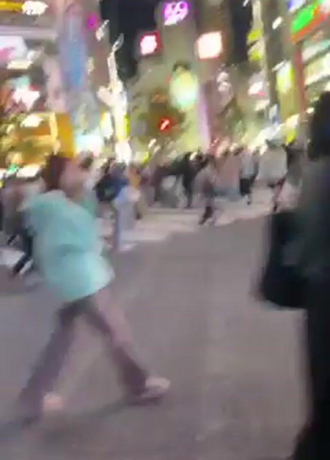crowded pedestrian intersection in a city at night, likely Shibuya, Tokyo
