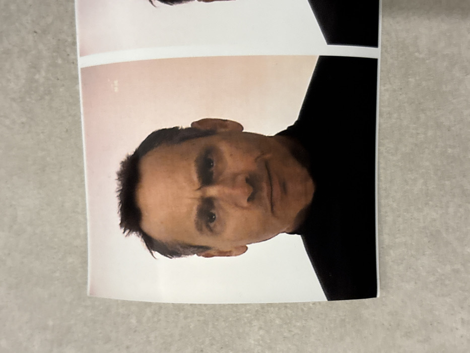 A close-up photo shows a man's face, slightly tilted. He has short, dark hair and an intense gaze. His eyebrows are furrowed, suggesting concern or contemplation. The man wears a black top, contrasting with the pinkish-white background of what appears to be a photograph strip. Another image is visible above him, partially out of focus, suggesting a series of photos of the same individual.