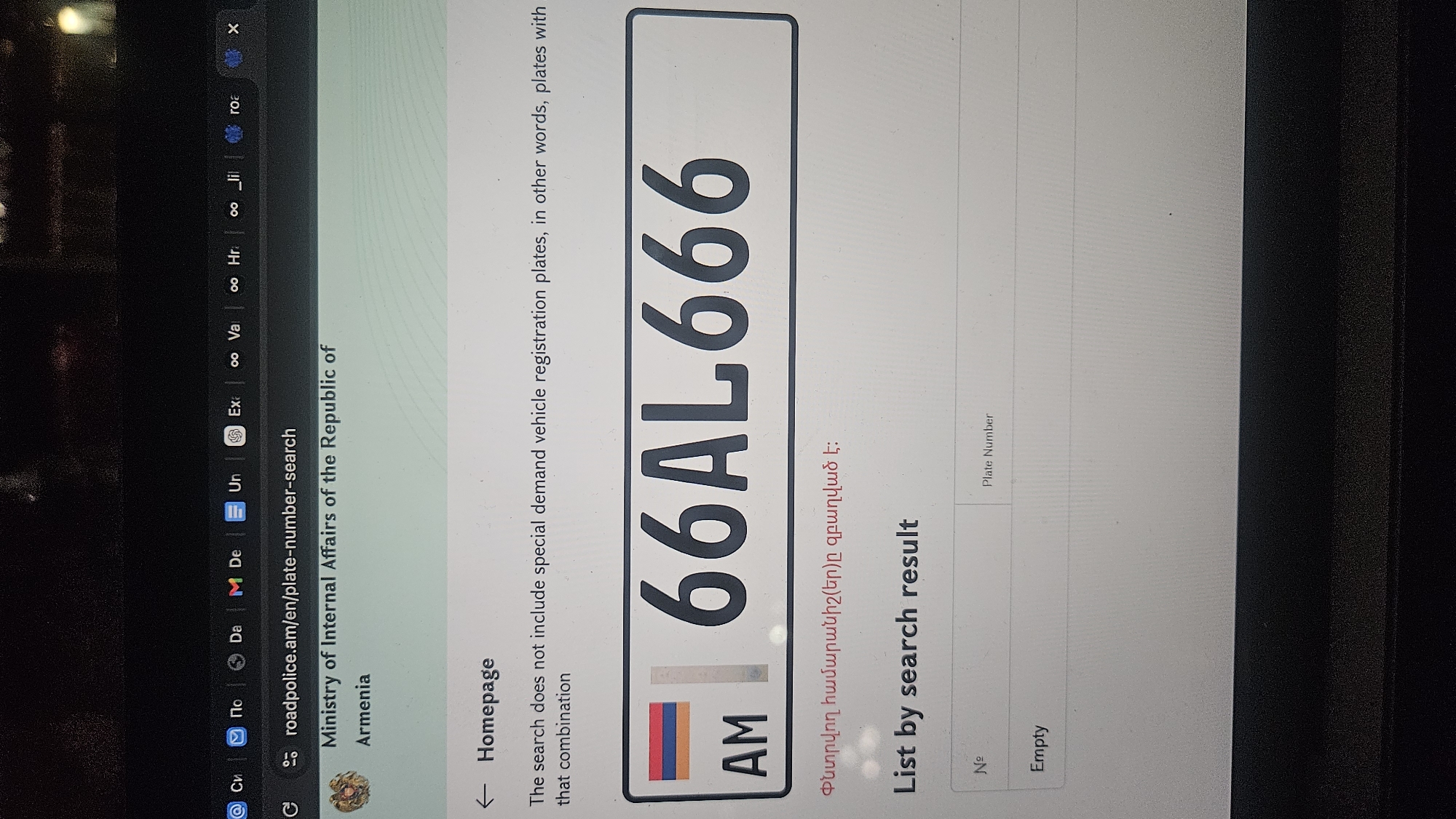 The image displays a computer screen showing a web browser accessing the URL `roadpolice.am/en/plate-number-search`. The displayed content is an official online service of the Ministry of Internal Affairs of the Republic of Armenia, concerning vehicle registration plate searches, relevant to operations throughout Armenia, including its capital, Yerevan. The screen's upper section contains multiple partially visible browser tabs and the full URL. Below, the page header identifies "Ministry of Internal Affairs of the Republic of Armenia" alongside an emblem. A textual disclaimer states: "The search does not include special demand vehicle registration plates, in other words, plates with that combination." The central element is a graphic representation of an Armenian vehicle registration plate. It features the Armenian national flag's red, blue, and orange vertical stripes on the far left, followed by the letters "AM" on a blue background. The main characters "66AL666" are prominently displayed in dark grey on a white background. Directly beneath this plate, red Armenian text is visible, which translates to "The searched number(s) is/are occupied/taken." Further down, a section titled "List by search result" presents a two-column table labeled "№" and "Plate Number." The first row of this table contains the word "Empty" under the "№" column, indicating no results were returned for the search. The ambient lighting of the environment appears dim, with reflections visible on the screen surface. No individuals or physical objects other than the screen are discernable.