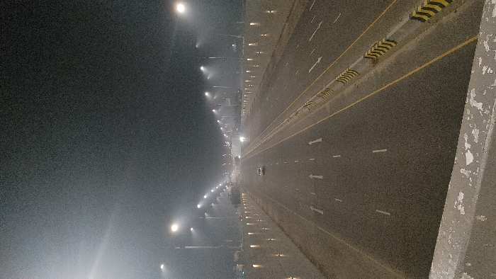 A nighttime view of a wide, empty highway stretches into the distance under the glow of streetlights. The road markings include lane dividers, arrows indicating direction, and safety barriers. Fog or smog obscures the left side of the image, muting the light. A concrete barrier is visible on the right, suggesting the perspective is from an elevated position, perhaps a bridge or overpass. A solitary vehicle appears far down the road.