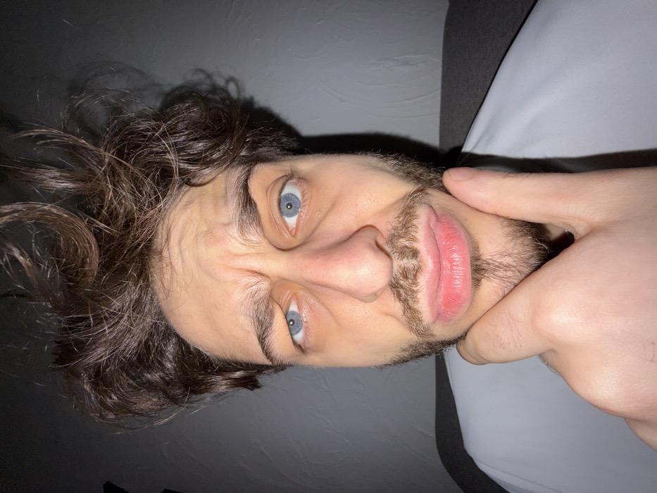 The scene is an indoor environment, location Unknown, Unknown. The primary subject is an adult male, captured in a close-up, head-and-shoulders view. He has disheveled, dark brown, curly hair and a short, light brown beard and mustache. His blue eyes are focused directly forward. The man's face exhibits a furrowed brow with visible forehead wrinkles, and his lips are pursed outward in a pout. His right hand is raised, with the index finger and thumb supporting the underside of his chin. He is wearing a light-colored top, possibly white, with a darker element visible on the right shoulder. The background features a textured grey wall on the left, receding into a darker, undefined area on the right, indicative of low lighting conditions.