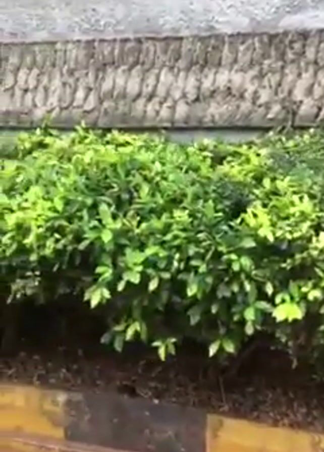The camera pans to the right along a stone wall with a green, leafy bush in front of it